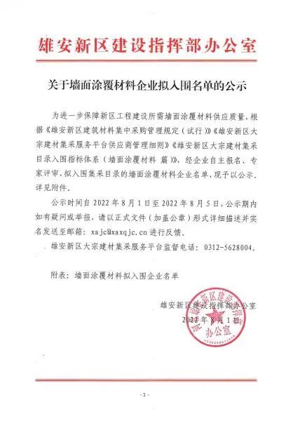 七月流火,白驹过隙,八月伊始,再传喜讯:8月1日,雄安新区建设指挥部办公室发布了关于墙面涂覆材料企业拟入围名单的公示,久诺集团凭借高质量产品、系统的涂装解决方案以及专业配套服务的强大优势赫然上榜!