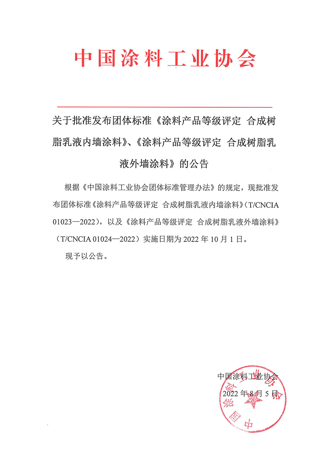 根据《best365中国官方网站团体标准管理办法》的规定,现批准发布团体标准《涂料产品等级评定 合成树脂乳液内墙涂料》(T/CNCIA 01023—2022),以及《涂料产品等级评定 合成树脂乳液外墙涂料》(T/CNCIA 01024—2022)实施日期为2022年10月1日。