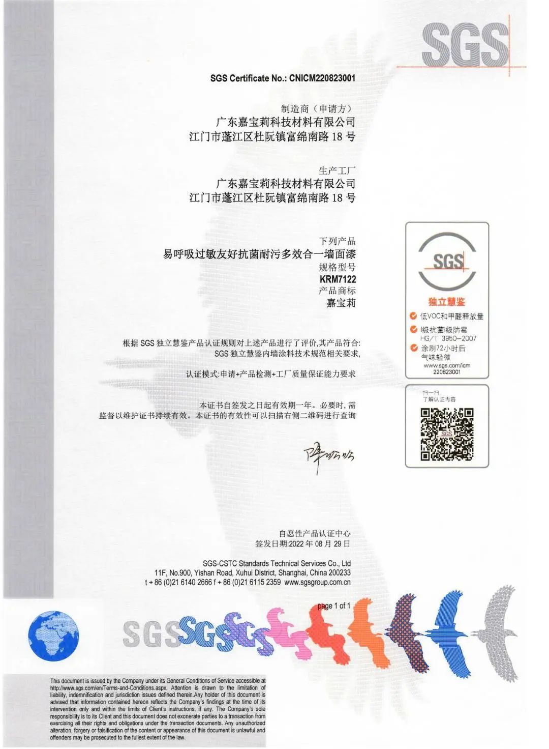 通过认证的产品将贴上独立慧鉴的认证标识向消费者传递信任,帮助消费者快速识别好产品。同时通过标识上的二维码,消费者可以查询认证内容和过程等信息,了解更多产品品质优势。未来,SGS将继续与嘉宝莉保持友好合作,共同探索健康涂料产品的更多发展可能。