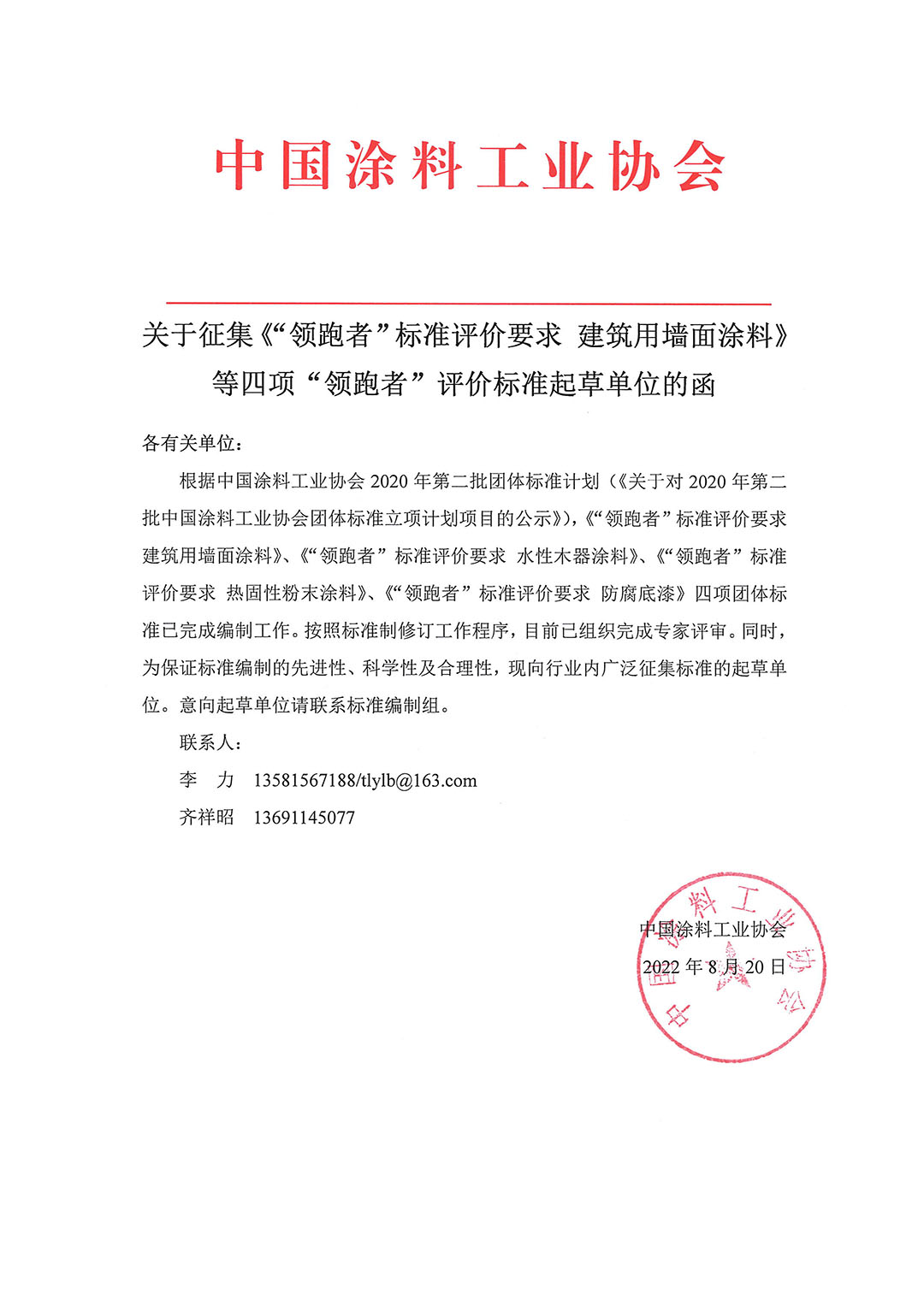 根据best365中国官方网站2020年第二批团体标准计划(《关于对2020年第二批best365中国官方网站团体标准立项计划项目的公示》),《“领跑者”标准评价要求 建筑用墙面涂料》、《“领跑者”标准评价要求 水性木器涂料》、《“领跑者”标准评价要求 热固性粉末涂料》、《“领跑者”标准评价要求 防腐底漆》四项团体标准已完成编制工作。按照标准制修订工作程序,目前已组织完成专家评审。同时,为保证标准编制的先进性、科学性及合理性,现向行业内广泛征集标准的起草单位。意向起草单位请联系标准编制组。