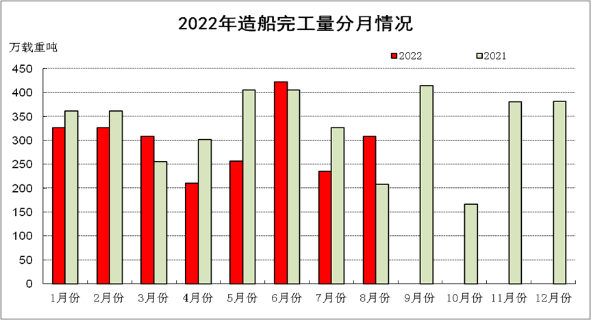 全国完工出口船2074万载重吨,同比下降15.9%;承接出口船订单2537万载重吨,同比下降42.5%;8月末手持出口船订单9030万载重吨,同比增长11.4%。出口船舶分别占全国造船完工量、新接订单量、手持订单量的86.6%、90.4%和88.5%。