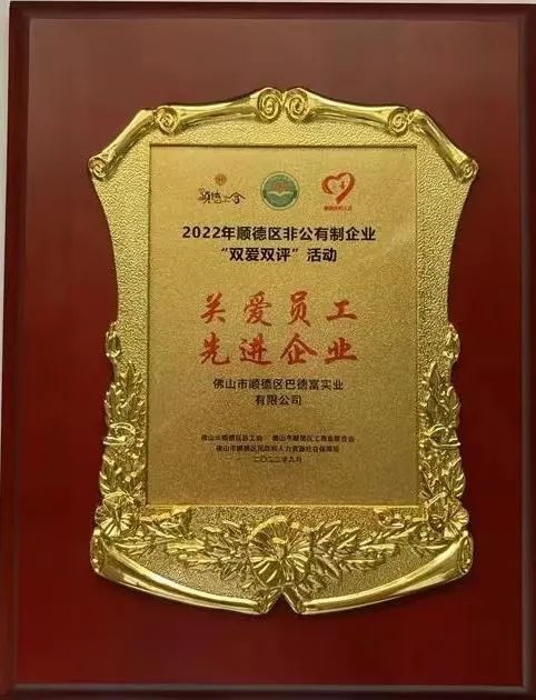 巴德富在推动就业纳税、人才结构、学习型组织、人才梯队、关爱员工、社会公益等方面的表现,获颁“顺德区关爱员工的先进企业”。顺德工厂工艺工程师吴德安在公司工作近二十年,本次获颁了“爱企敬岗的优秀员工”。2022年5月,在巴德富集团“致敬劳动者·礼赞奋斗者”首届工匠文化节顺德区域表彰大会中,吴德安也获评了“工匠代表”。吴德安获得公司内外荣誉,这是巴德富引导员工不断学习、提升自我,与企业共同发展、互相成就的一个缩影。