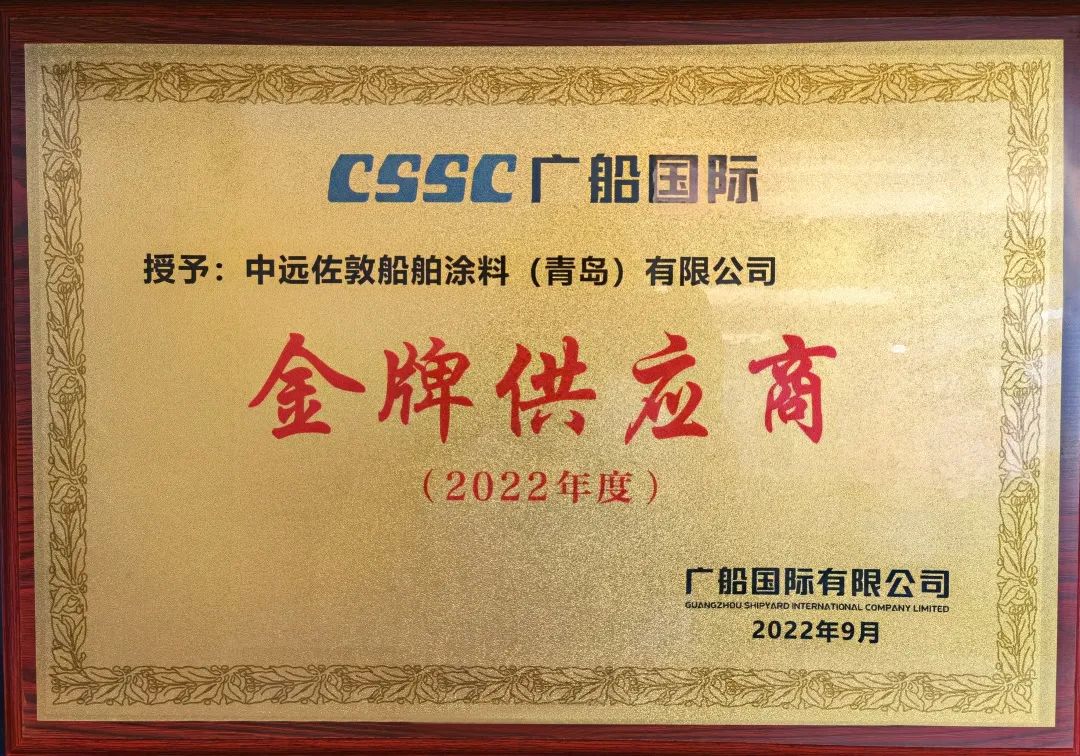 “中远佐敦船舶涂料(青岛)有限公司,作为广船国际长期合作的主要油漆供应商,过去两年累计供货34艘船约686万升油漆,产品质量稳定,供应链高效。在疫情期间,仍以高度的责任心和契约精神,克服困难,按时按量完成油漆供应任务。率先配合广船国际开展工艺和技术创新,推进大包装油漆的使用,并协助广船国际持续推进油漆用量控制,降低综合成本,减少VOC排放”。