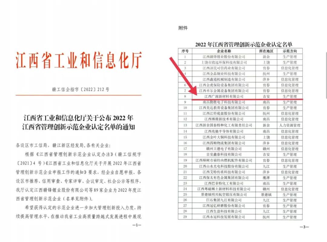 近日,江西省工业和信息化厅公布了“2022年江西省管理创新示范企业”认定名单,广源集团旗下全资子公司江西广源新材料有限公司凭借先进的生产管理模式,榜上有名。