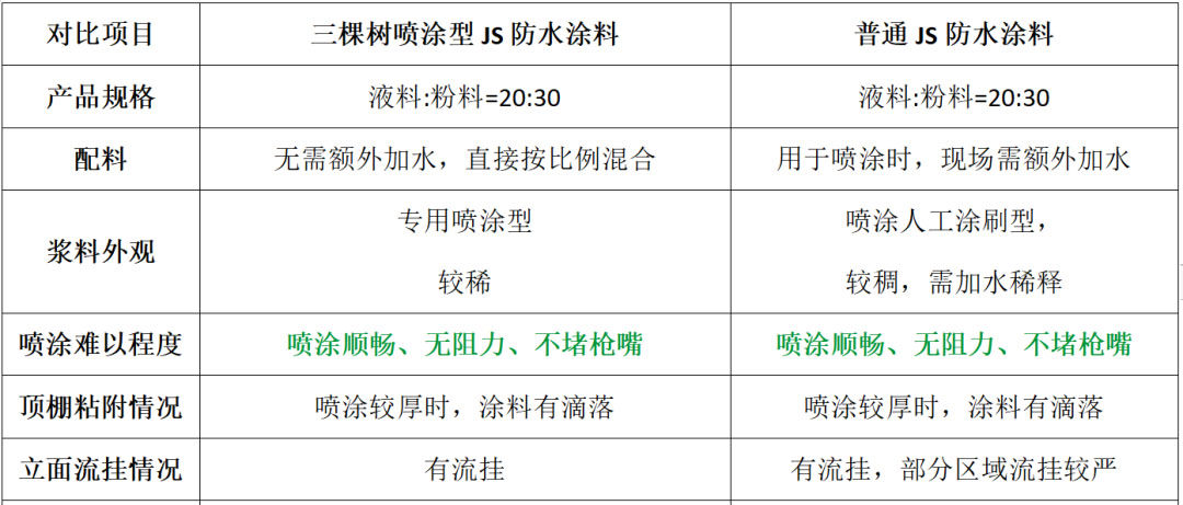 市面上普通JS用于现场喷涂,需要额外加水稀释,而现场加水难以控制量,影响组分配比,间接影响成膜效果。三棵树防水推出的新型SGW102PT喷涂型聚合物水泥防水涂料(JSⅡ)施工前无需另外加水,解决了由于现场施工无法控制配比的问题,保留防水涂料自身的水乳比例。产品采用机械喷涂施工,固化后形成致密、高强、坚韧、耐久的弹性涂膜防水层。