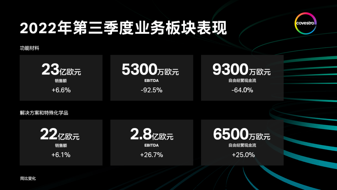 在汇率波动和销售价格水平上涨的背景下,第三季度功能材料业务板块销售额同比增长6.6%至23亿欧元。相反,因需求下滑导致的产品总销量下降带来了负面影响。该板块EBITDA下降92.5%至5300万欧元。这主要归因于利润率的下降,因为销售价格水平提高只能在很小程度上抵消原材料和能源价格的上涨。特别受EBITDA下降影响,功能材料业务板块自由经营现金流减少64%至9300万欧元。