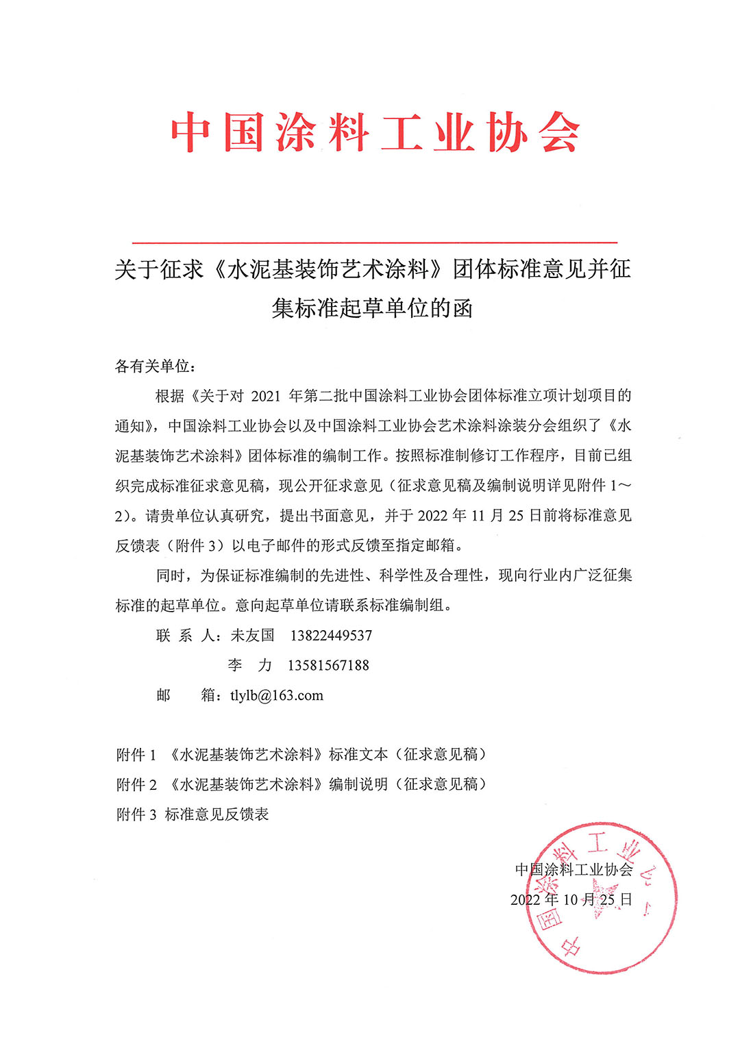 根据《关于对2021年第二批best365中国官方网站团体标准立项计划项目的通知》,best365中国官方网站以及best365中国官方网站艺术涂料涂装分会组织了《水泥基装饰艺术涂料》团体标准的编制工作。按照标准制修订工作程序,目前已组织完成标准征求意见稿,现公开征求意见(征求意见稿及编制说明详见附件1~2)。请贵单位认真研究,提出书面意见,并于2022年11月25日前将标准意见反馈表(附件3)以电子邮件的形式反馈至指定邮箱。
