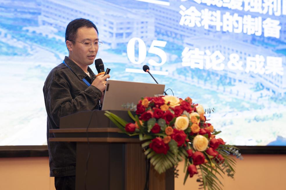 海洋化工研究院有限公司研究中心主任吴连锋就“难粘材料用耐高温隔热涂层研究进展”做主题报告,他首先从难粘材料应用场景、抗粘机理、海洋环境涂层失效现状分析了难粘耐高温材料研发的重要意义与需求;第二,从聚四氟乙烯(PTFE)粘接技术研究现状、粘接机理、包括等离子技术、电流处理技术及常规萘化学处理在内的预处理技术做详细介绍;对比分析五种含苯并噁嗪基团有机硅化合物的合成工艺及粘接性能,并分析其化学键结构引入对其表面能影响及在PTFE板上附着力的变化;第三,重点就高韧性耐高温隔热涂层的配方设计、树脂体系及固话体系选择、颜基比对柔性和硬度综合影响、机械性能、热物理性能、微观形貌和化学结构变化等方面做讲解;第四,通过实际案例分析了苯并噁嗪基底涂剂和有机硅耐高温透波隔热涂料的固化工艺,以及对改性PTFE基材附着力的变化及涂层耐高温透波隔热性能。