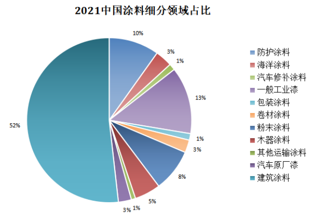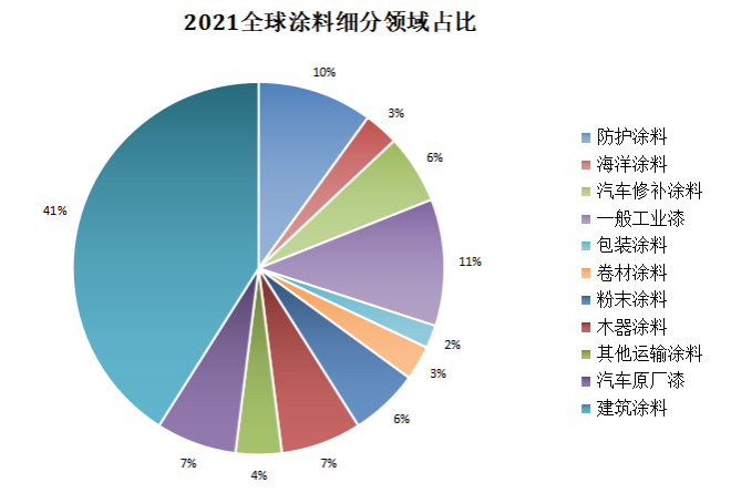 刘杰指出,从2021年中国与全球涂料行业细分对比来看,中国涂料行业细分领域占比与全球涂料细分领域占比并无太大差异,建筑涂料占比最大,其次是防护涂料。