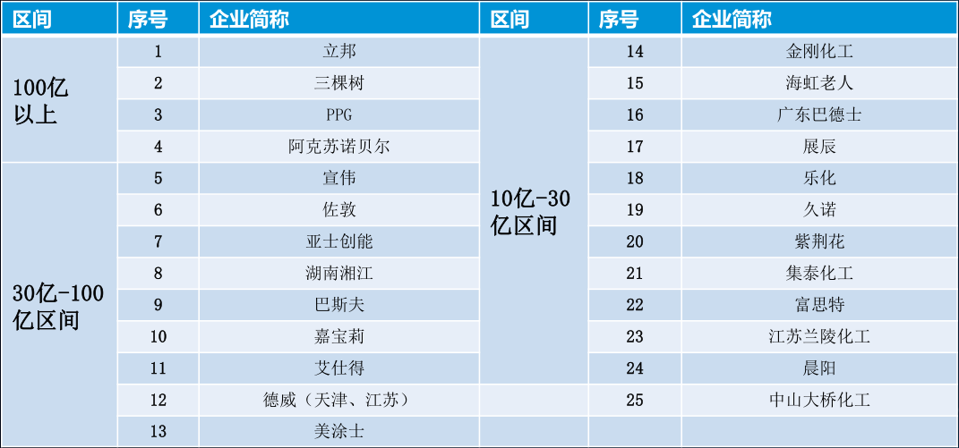 他还对行业“一百指数”企业进行了概括分析。他表示,可喜的是,中国100亿元以上的涂料企业已经有四家,30~100亿元的企业有9家,10~30亿元的企业有12家,种种迹象表明,中国涂料已经在由大而强的路上迈出了可喜的一步。