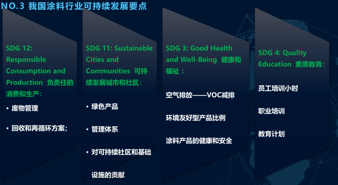 为此,中国涂料行业也要跟上全球涂料行业的发展步伐,要聚焦“负责任的消费和生产”、“可持续发展城市和社区”、“健康和福祉”、“素质教育”这四大关键点进行发展。