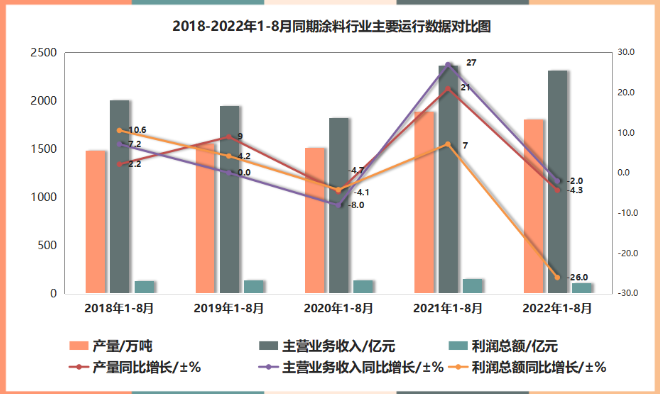 2022年1-8月,我国涂料行业全行业总产量约2259.7万吨(含规模以下部分),较去年同期同比降低4.3%;主营业务收入总额约2897.6亿元,较去年同期同比降低2.0%;利润总额约141.1亿元,较去年同期同比降低26.0%。