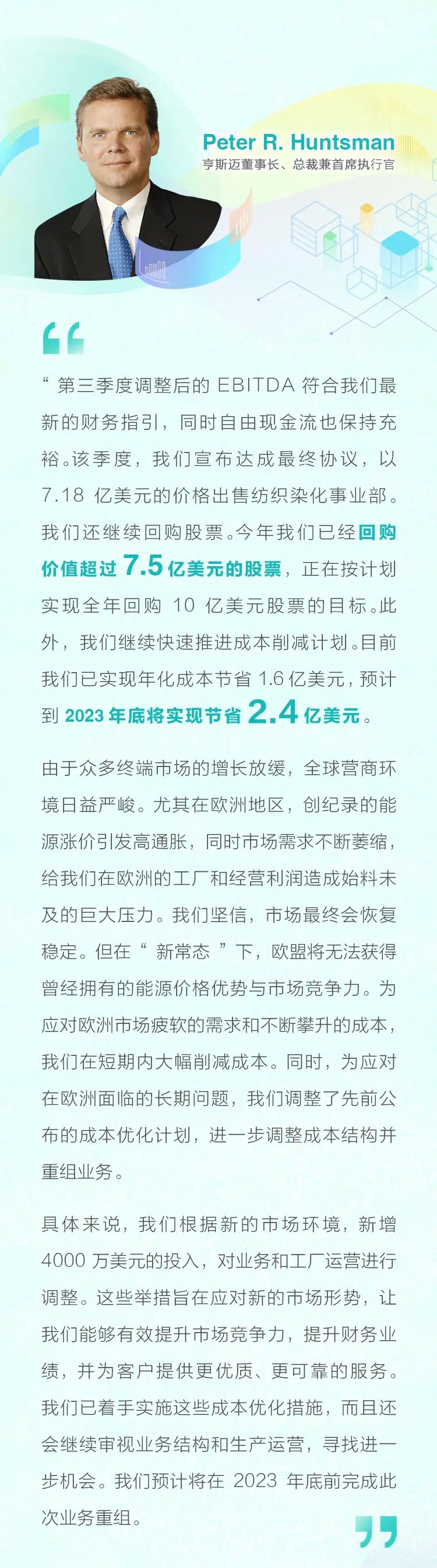 财报|亨斯迈前三季度回购超过7.5亿美元股票