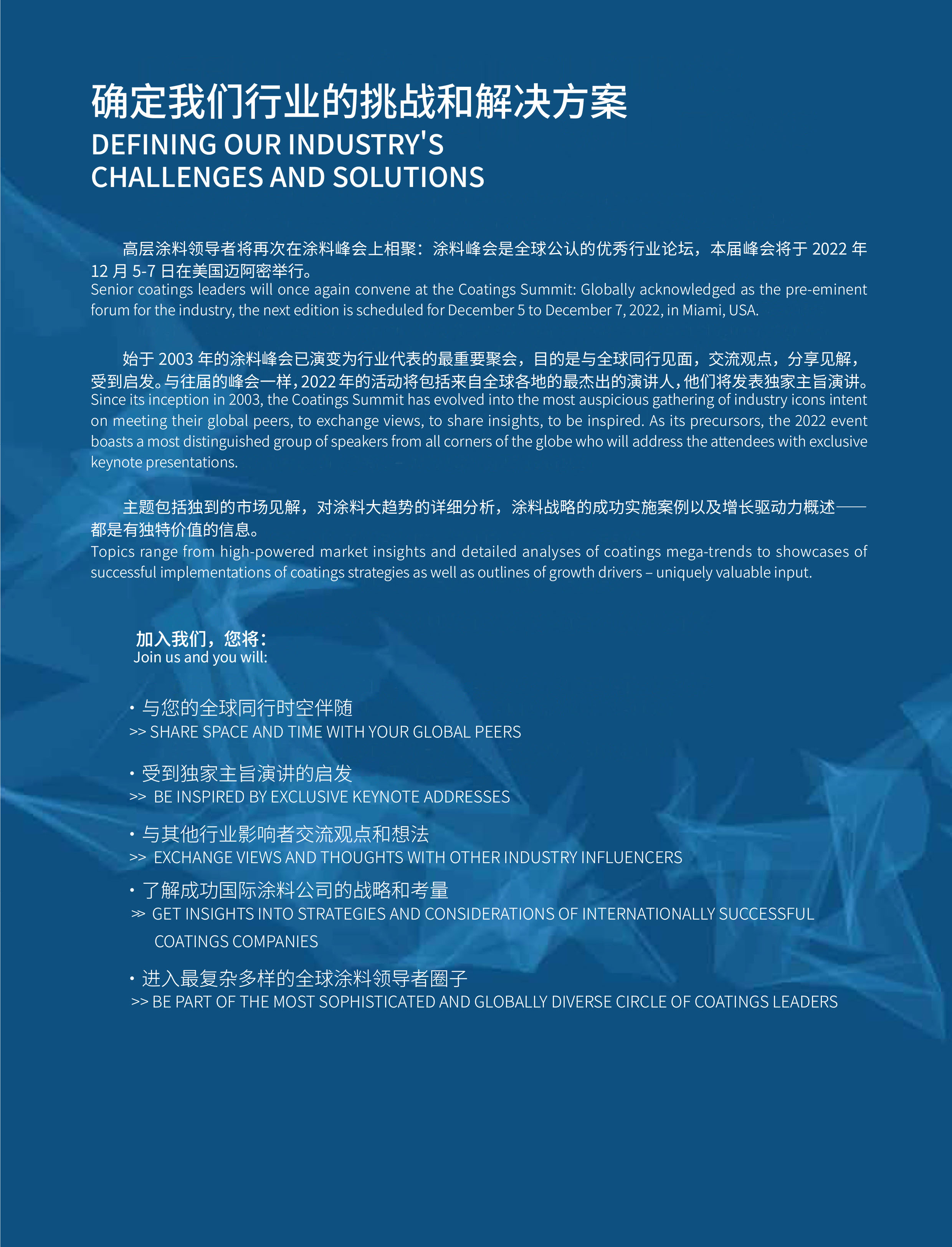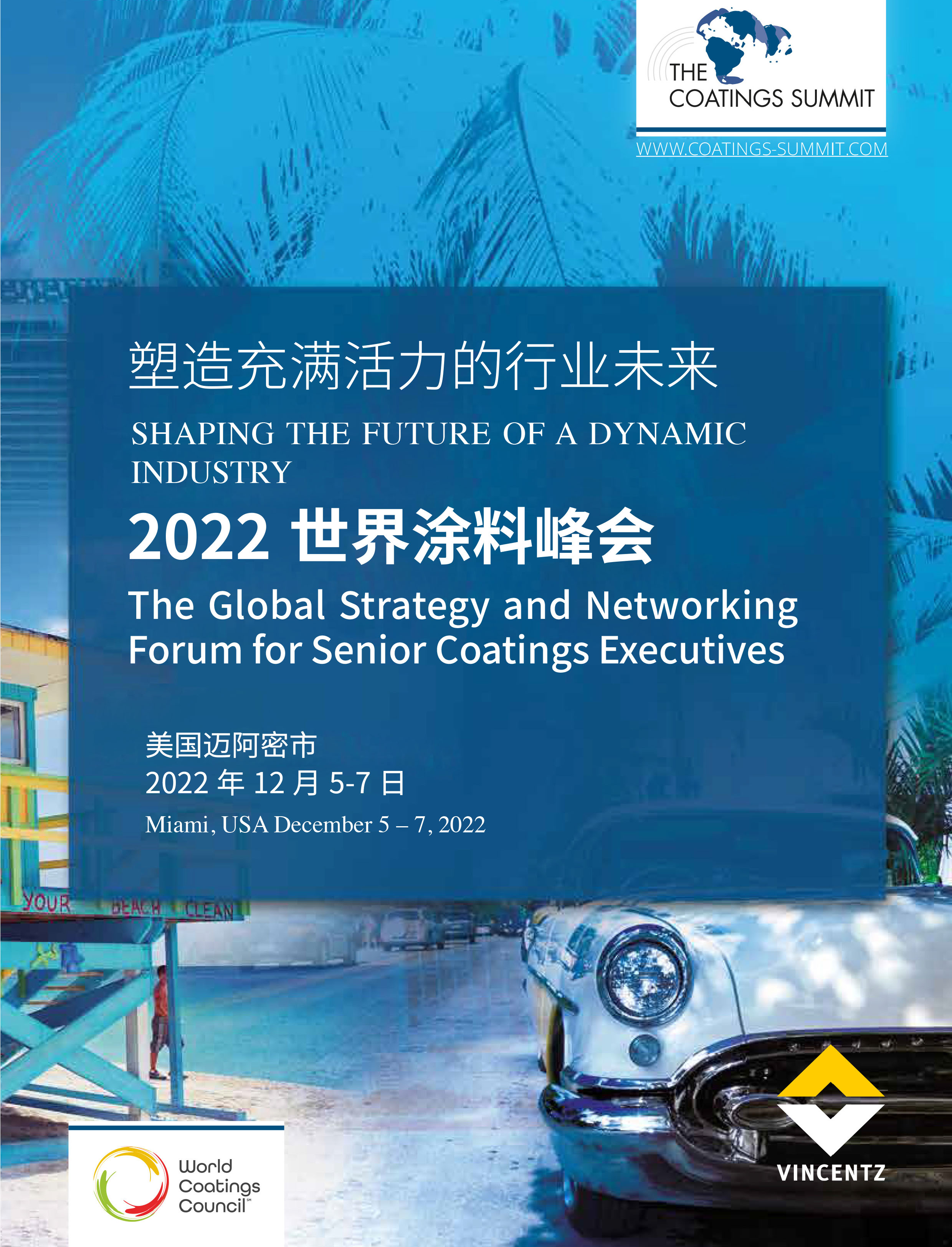 世界涂料峰会是全球公认的优秀行业论坛,本届峰会将于2022年12月5-7日在美国迈阿密举行。