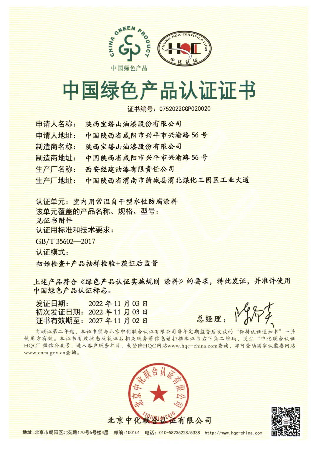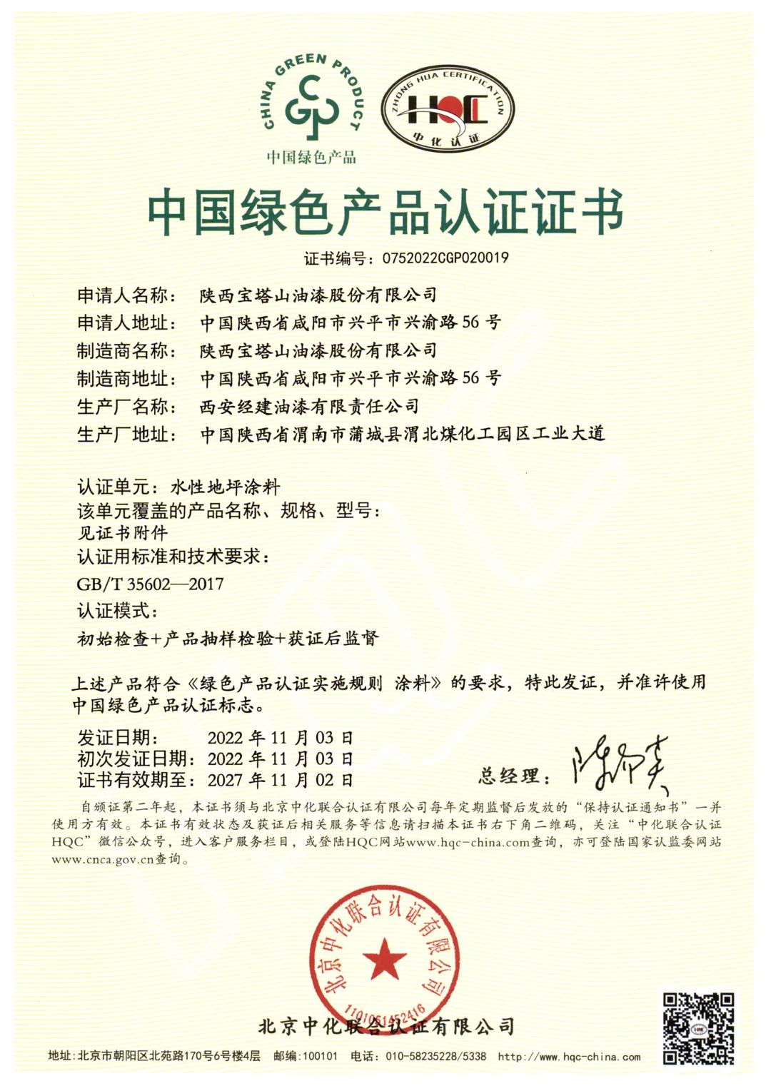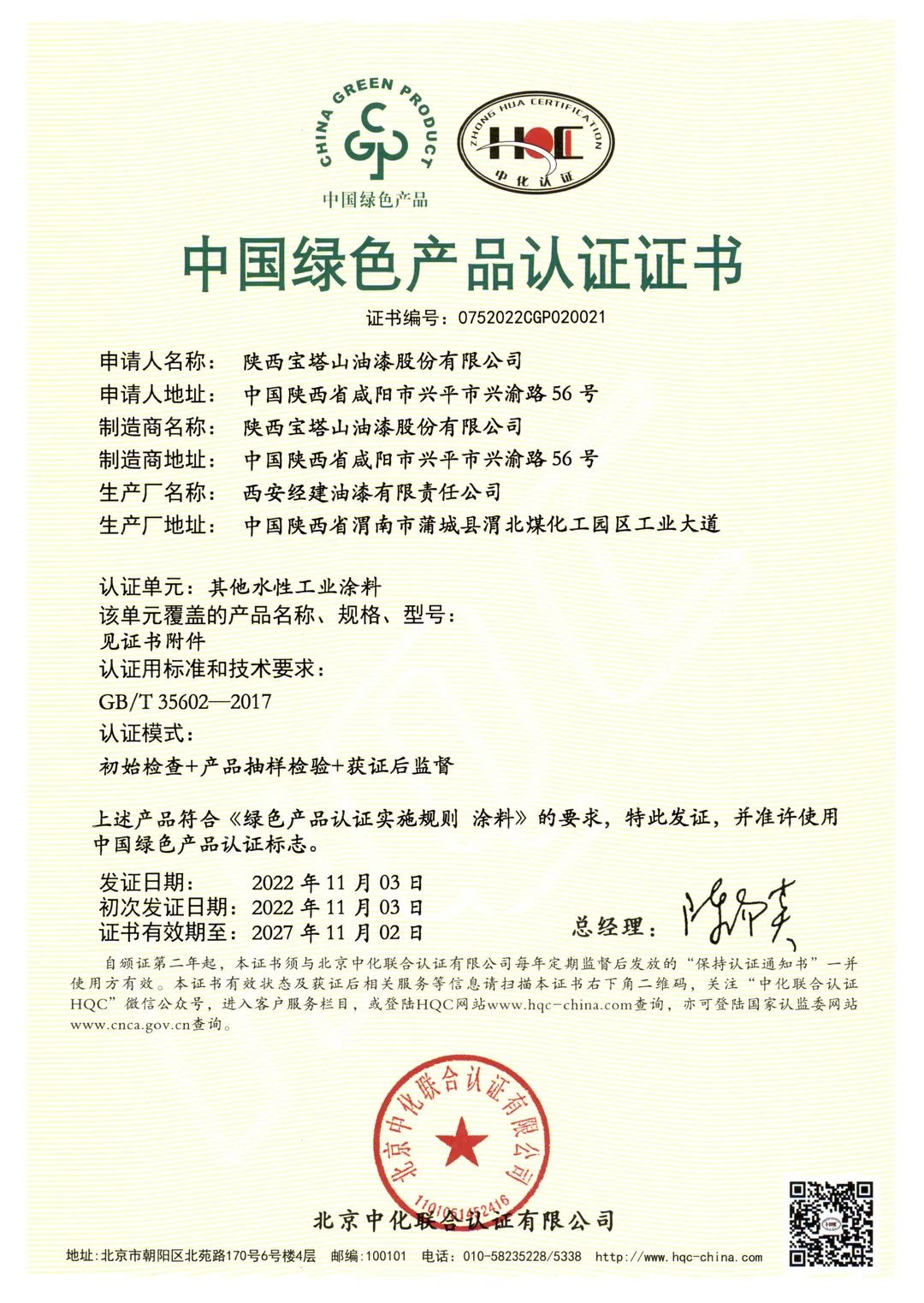 北京中化联会认证有限公司(HQC)资深专家根据国家标准GB/T35602-2017《绿色产品评价 涂料》和CNCA-CGP-02:2021《绿色产品认证实施规则 涂料》的要求,对宝塔山漆水性地坪涂料、室内用常温自干型水性防腐涂料、其他水性工业涂料3个单元11款产品,从资源、能源、环境、品质4大指标进行评审,并顺利通过审核,获得中国绿色产品认证。