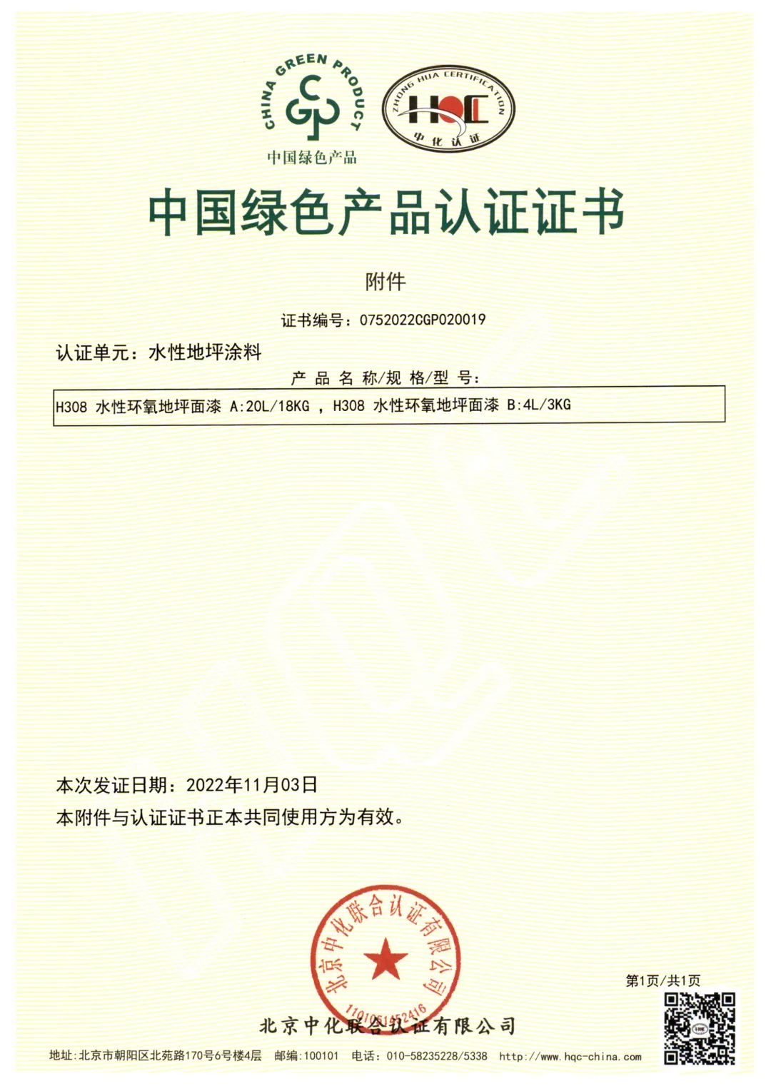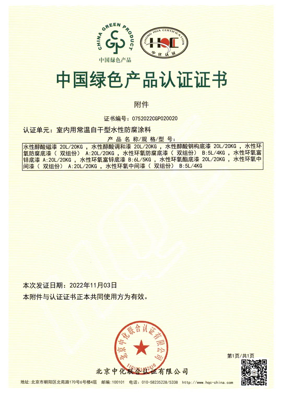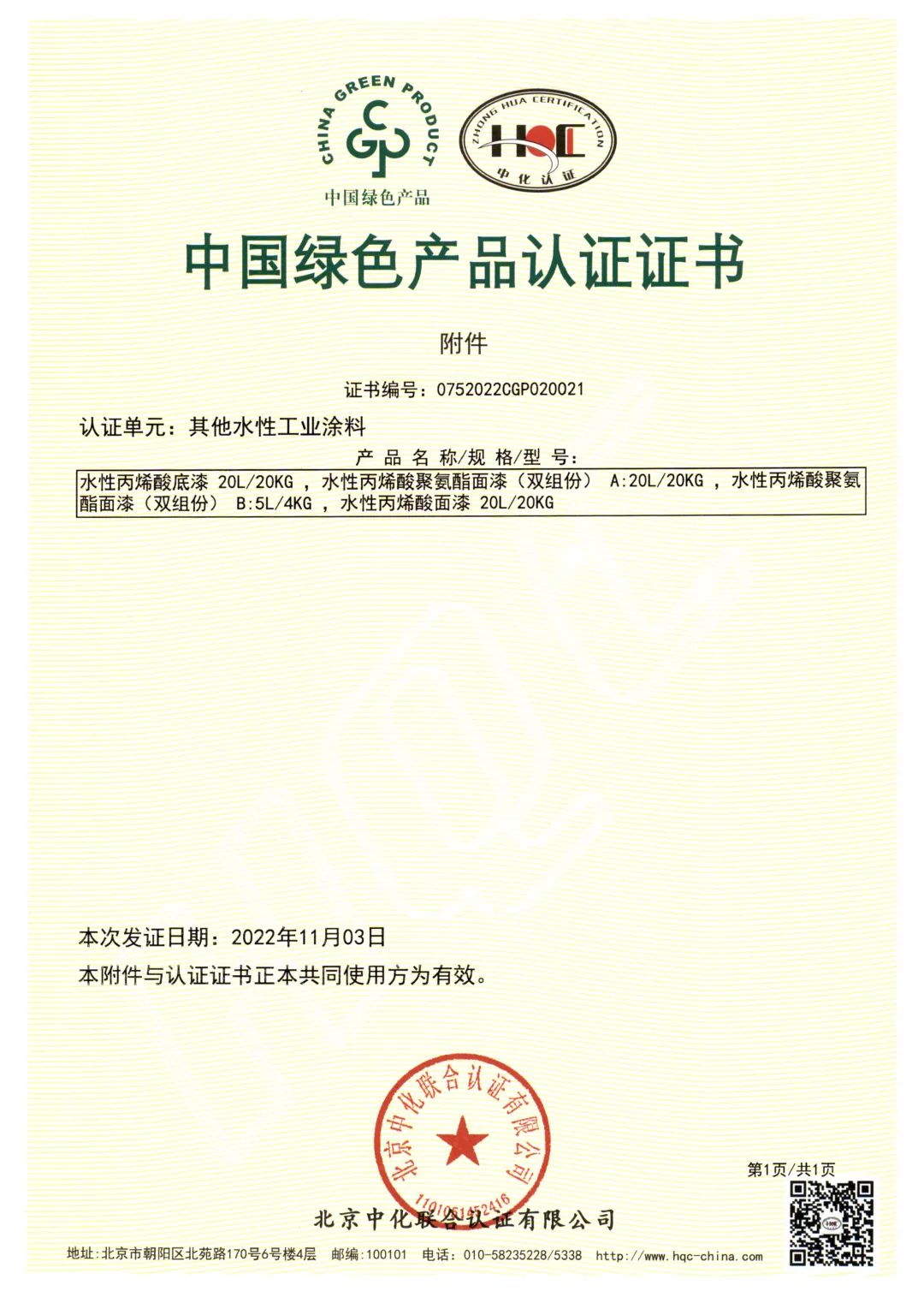 北京中化联会认证有限公司(HQC)资深专家根据国家标准GB/T35602-2017《绿色产品评价 涂料》和CNCA-CGP-02:2021《绿色产品认证实施规则 涂料》的要求,对宝塔山漆水性地坪涂料、室内用常温自干型水性防腐涂料、其他水性工业涂料3个单元11款产品,从资源、能源、环境、品质4大指标进行评审,并顺利通过审核,获得中国绿色产品认证。