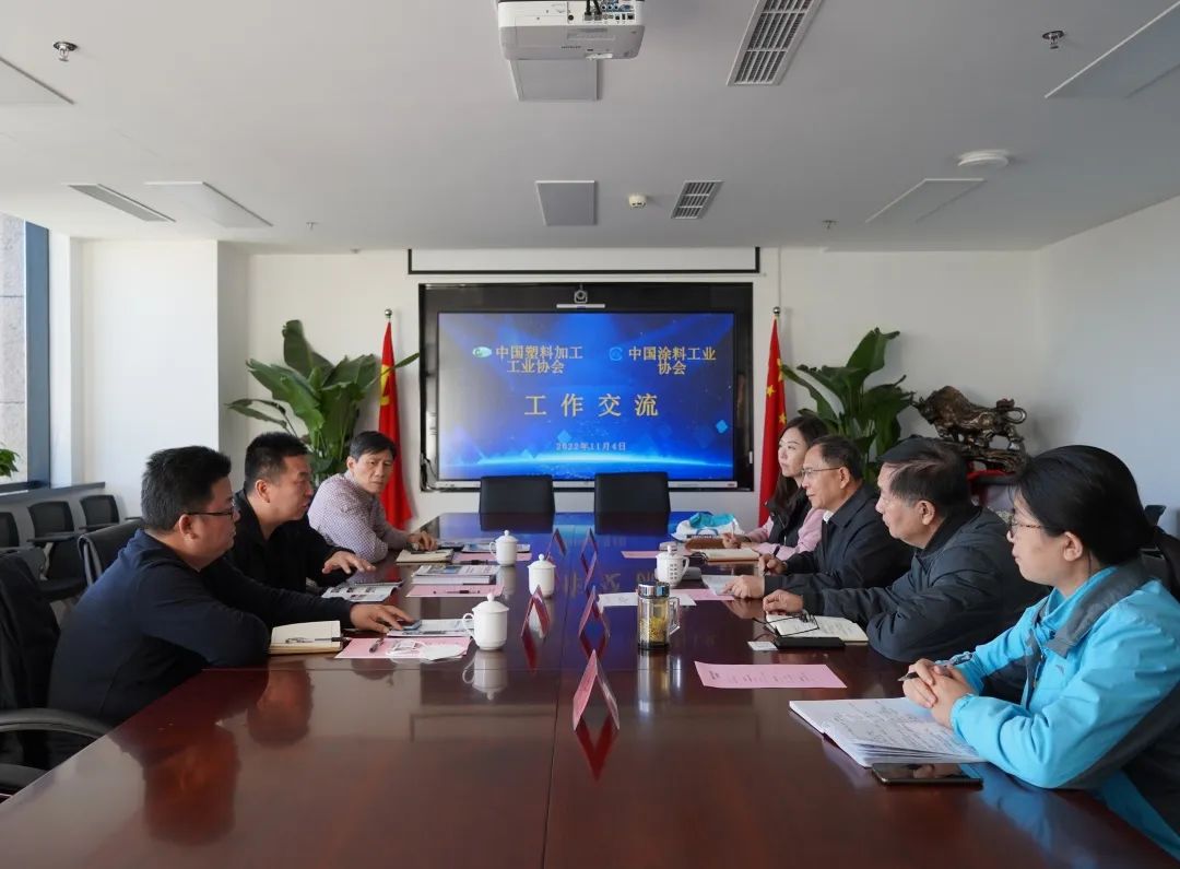 2022年11月4日,best365中国官方网站代秘书长刘杰、产业发展部部长王臻、钛白粉分会副秘书长陈钢一行来到中国塑料加工工业协会,与中国塑协理事长王占杰、副理事长王磊光、副秘书长兼经济合作部主任贾宁、综合业务部主任于坤,就中国涂料行业及塑料行业发展情况、两协会会议和展览举办情况进行深入交流。