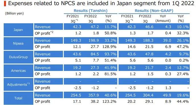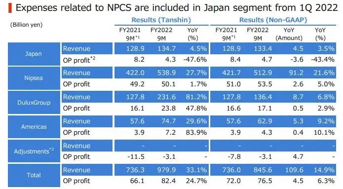 前三季度立邦在日本地区的营收同比增长4.5%至1347.15亿日元(约合68亿元人民币)。受原材料价格上涨等因素影响,营业利润同比下降47.6%至43.11亿日元(约合2亿元人民币)。从第一季度开始,除与上市公司功能相关的业务和费用此前计入“调整”的纯控股公司以外的所有业务均被剥离,移至日本部门,这一调整的目的,是为了更恰当地反映各应报告部门的经营业绩。