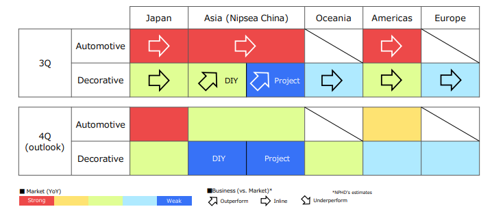 第三季度,全球汽车制造业市场表现出显著的反弹,使得立邦汽车涂料业务在日本、中国、东南亚和美洲的地区保持了稳定的增长势头。第四季度受季节性原因,中国、东南亚的汽车市场可能会放缓节奏,但美洲和日本依旧市场看好。