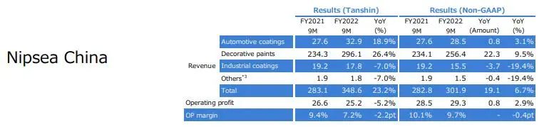 前三季度由于半导体芯片短缺和其他因素导致汽车生产数量下降,导致日本本土的汽车涂料销售收入下降。受新建住宅开工稳定和其他有利市场条件的推动,工业涂料收入增加。由于市场条件的改善,装饰涂料收入也有所增加。