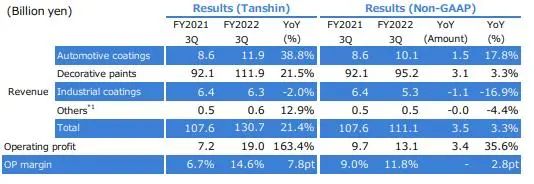 第三季度,立时集团营收同比增长33.2%至1989亿日元(约合100亿元人民币);营业利润同比增长128.9%至277亿日元(约合14亿元人民币)。 前三季度,立时集团营收同比增长27.7%至5389.39亿日元(约合272亿元人民币);营业利润同比增长1.7%至509.2亿日元(约合26亿元人民币)。其中,汽车涂料的销售收入增加,主要是由于在截至2022年9月30日9个月里,尽管半导体芯片短缺,但中国和泰国制造的汽车数量还是有所增加。装饰涂料收入增加的原因是,尽管受到封锁和其他限制措施的影响,但中国现有住宅内部重新粉刷的涂料需求持续强劲,加上中国、马来西亚、印度尼西亚和土耳其等主要市场的销售价格大幅上涨。