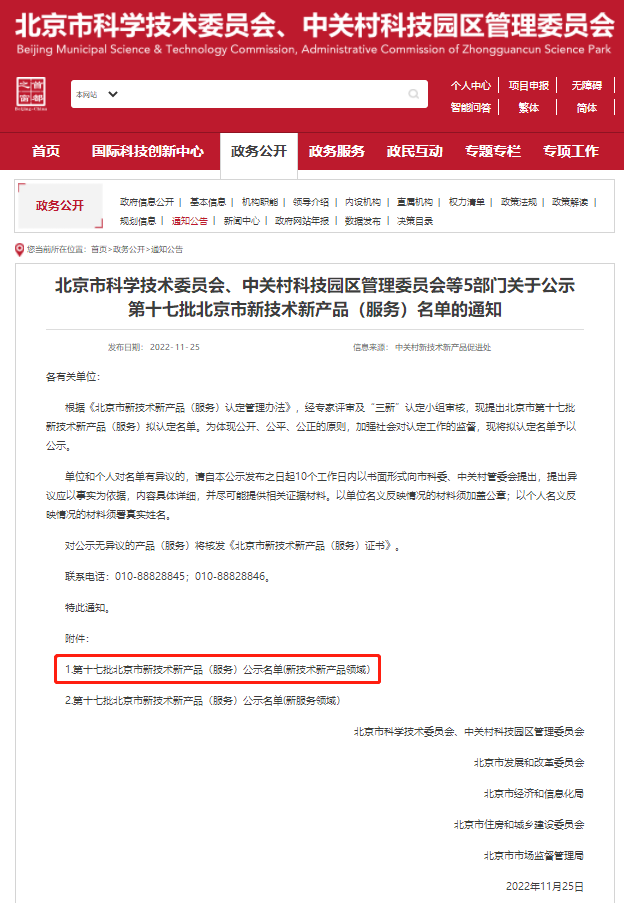近日,北京市科学技术委员会、中关村科技园区管理委员会等部门公布了第十七批北京市新技术新产品(服务)认定名单。
