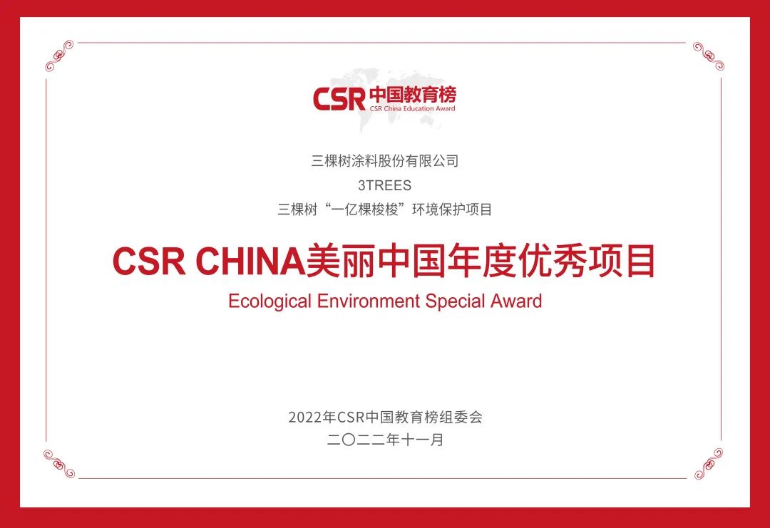 近日,2022年企业社会责任教育项目优秀案例征集暨第六届CSR中国教育榜奖项正式发布。三棵树凭借在环境保护、乡村振兴两个方面持续社会贡献,从百家中外企业中脱颖而出,荣膺“CSR CHINA TOP100 年度最佳责任企业品牌”称号;同时,三棵树“一亿棵梭梭”环境保护项目荣获“CSR CHINA美丽中国年度优秀项目”;三棵树“助农村发展”乡村振兴项目荣获“CSR CHINA乡村振兴年度优秀项目”。