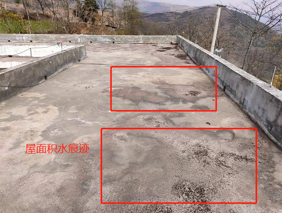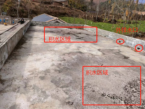 在考察的过程中,韩工发现小学是老旧屋面,大面积分布着龟裂纹,同时存在较大裂缝,漏水较为严重。整个屋面无找坡层,平整度较差,低洼处存在严重的积水现象,且落口管口全部被杂物堵死。