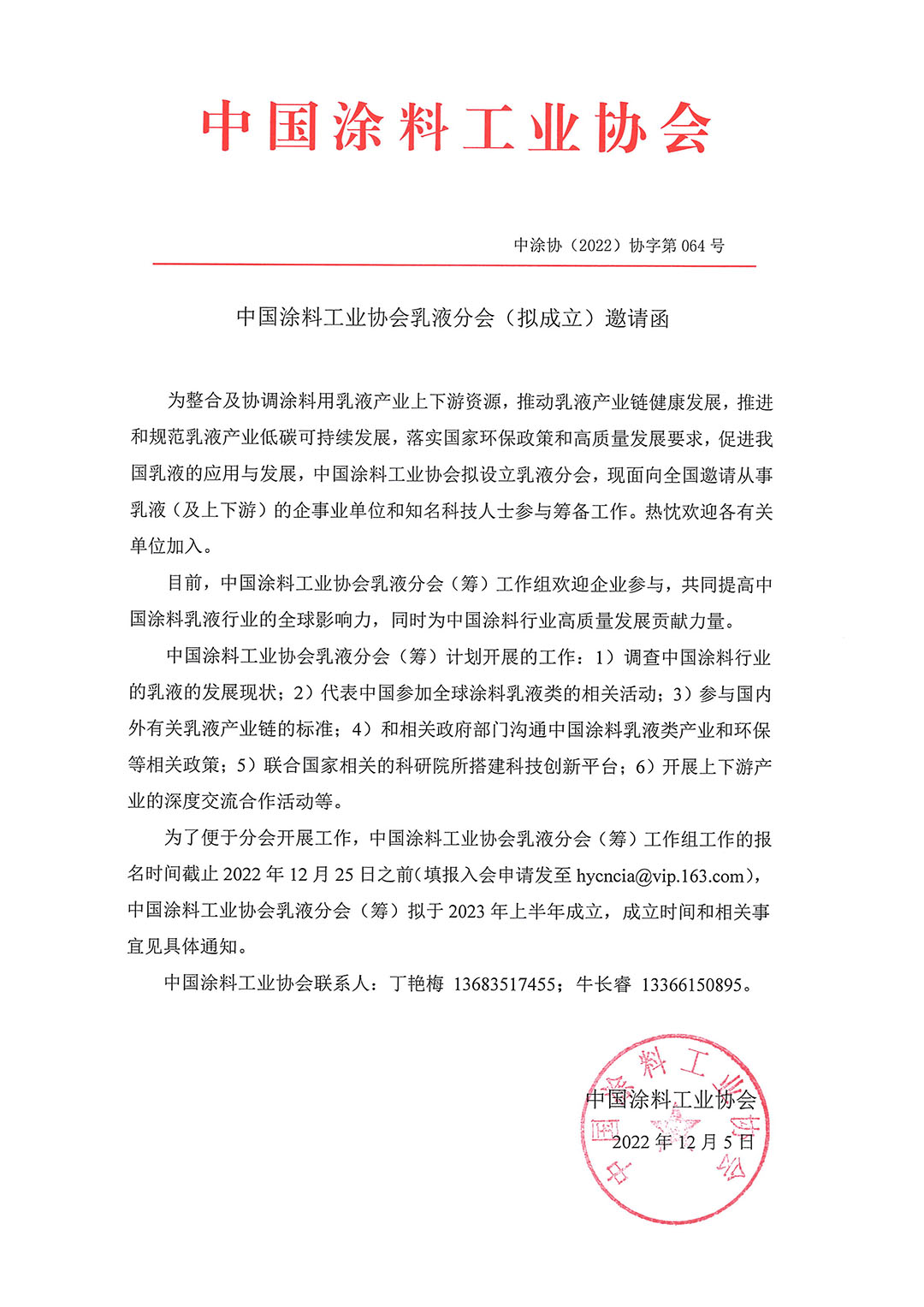 为整合及协调涂料用乳液产业上下游资源,推动乳液产业链健康发展,推进和规范乳液产业低碳可持续发展,落实国家环保政策和高质量发展要求,促进我国乳液的应用与发展,best365中国官方网站拟设立乳液分会,现面向全国邀请从事乳液(及上下游)的企事业单位和知名科技人士参与筹备工作。热忱欢迎各有关单位加入。