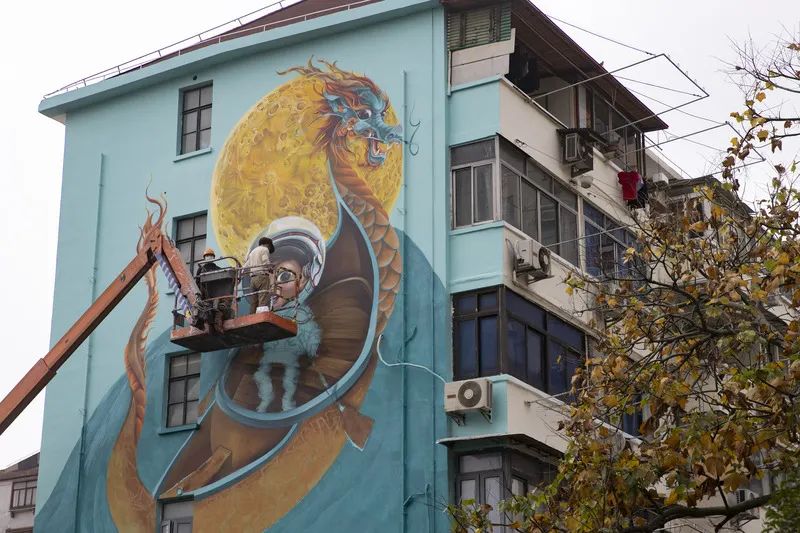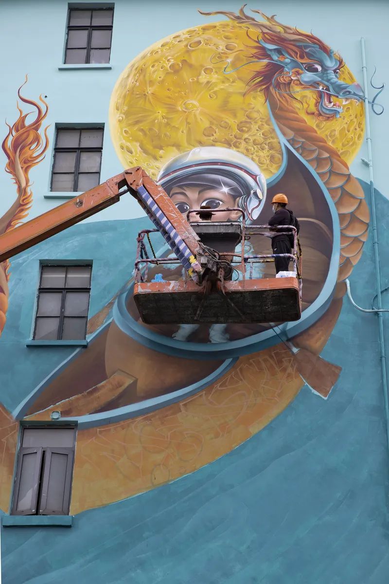 机器轰鸣声中,登高车缓缓上升,站在车厢内的墙绘艺术家Max逐渐变成一个小黑点。他操控着手柄,在位于阜新路上的一座高16米的居民楼外墙上作画。在他笔下,一名宇航员正划着龙舟驶向月球。