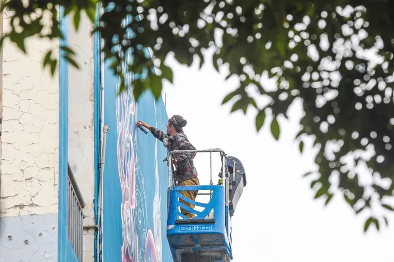 今年“为爱上色”在成都创作墙绘时遇上大暴雨,艺术家在当地待了一个月,等到可以施工时,又是高温曝晒的天气。“因为担心再次赶上暴雨,艺术家每天都顶着烈日赶工期,居民看了不忍心,劝他休息,但他仍继续坚持。”