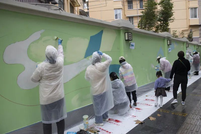 11月19日一早,位于彰武路上的同济新村围墙外开始聚集起参加墙绘的志愿者。60位公益合伙人由家住周边的居民、同济大学学生、立邦员工以及路过的居民志愿者组成。他们在150米长的围墙外站成一排,或站或蹲,细细描绘家门口的这一方彩色天地。