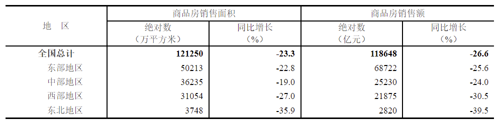 1—11月份,商品房销售面积121250万平方米,同比下降23.3%,其中住宅销售面积下降26.2%。商品房销售额118648亿元,下降26.6%,其中住宅销售额下降28.4%。