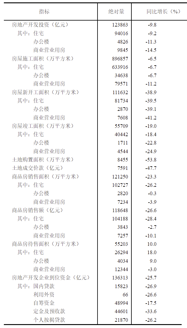 1—11月份,房地产开发企业房屋施工面积896857万平方米,同比下降6.5%。其中,住宅施工面积633916万平方米,下降6.7%。房屋新开工面积111632万平方米,下降38.9%。其中,住宅新开工面积81734万平方米,下降39.5%。房屋竣工面积55709万平方米,下降19.0%。其中,住宅竣工面积40442万平方米,下降18.4%。