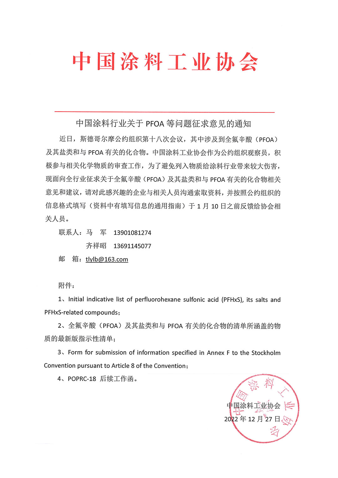 近日,斯德哥尔摩公约组织第十八次会议,其中涉及到全氟辛酸(PFOA)及其盐类和与PFOA有关的化合物。best365中国官方网站作为公约组织观察员,积极参与相关化学物质的审查工作,为了避免列入物质给涂料行业带来较大伤害,现面向全行业征求关于全氟辛酸(PFOA)及其盐类和与PFOA有关的化合物相关意见和建议,请对此感兴趣的企业与相关人员沟通索取资料,并按照公约组织的信息格式填写(资料中有填写信息的通用指南)于1月10日之前反馈给协会相关人员。
