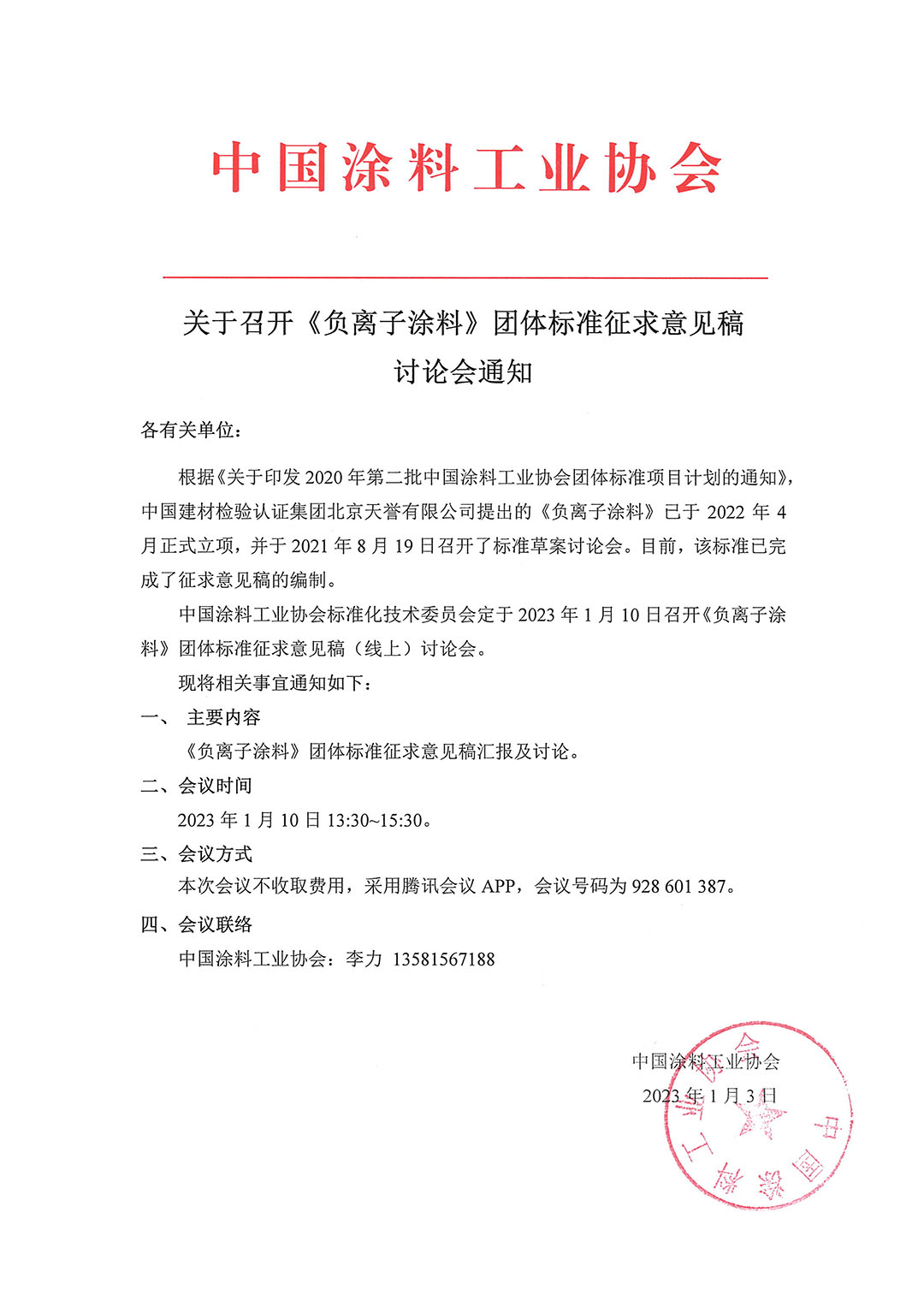 best365中国官方网站标准化技术委员会定于2023年1月10日召开《负离子涂料》团体标准征求意见稿(线上)讨论会。