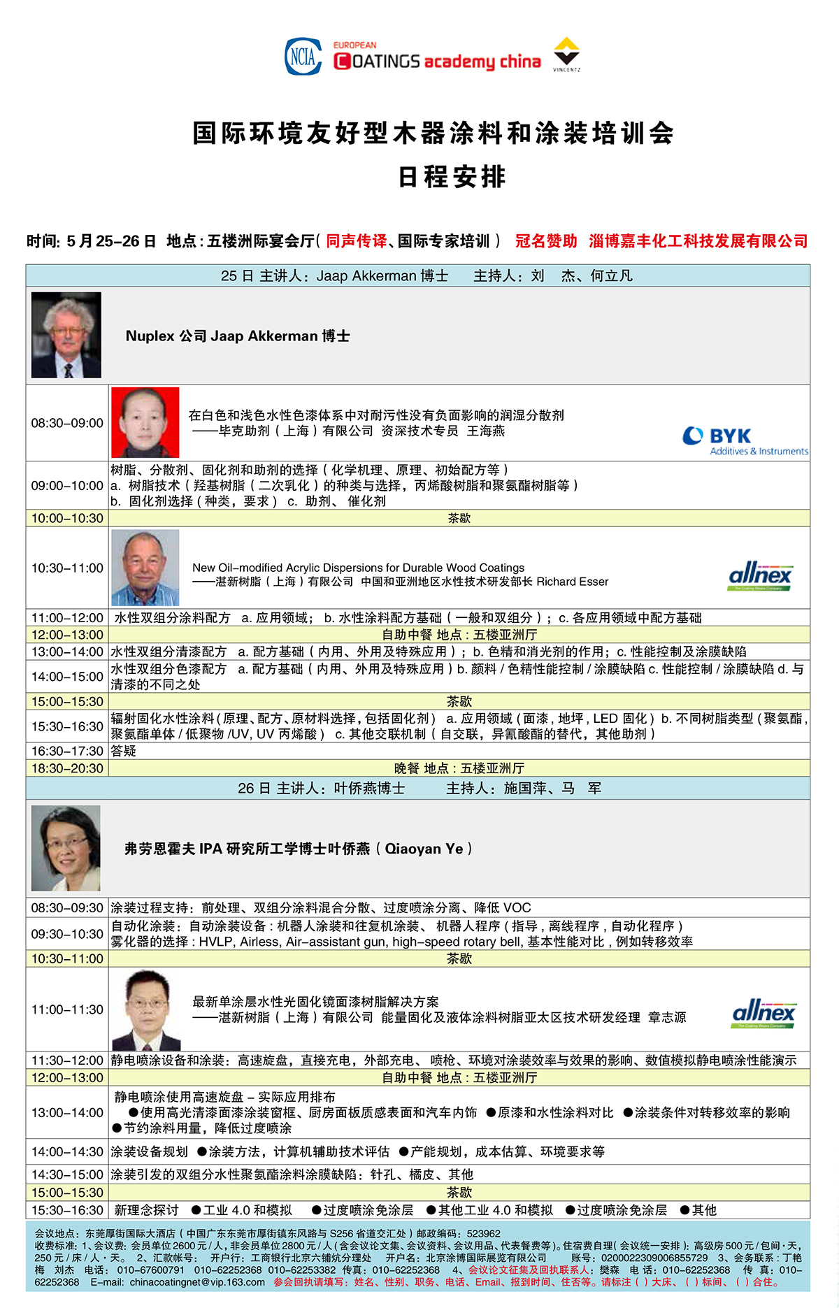 此次培训会旨在践行绿色发展、推进涂料行业的绿色发展的大背景下,学习国际先进的环境友好型木器涂料及涂装技术,贯彻创新、开放、共享发展的理念,“引进来,走出去”,特别邀请了欧洲木器涂料、涂装领域的资深专家Nuplex 公司Jaap Akkerman 博士、弗劳恩霍夫IPA 研究所工学博士叶侨燕女士,以及BYK资深技术专员王海燕女士、湛新树脂中国和亚洲地区水性技术研发部长Richard Esser和能量固化及液体涂料树脂亚太区技术研发经理章志源先生与学员进行环境友好型木器涂料和涂装国际先进技术的培训交流。未来两天将会围绕水性双组分涂料、水性UV涂料等环境友好型涂料的应用领域、不同应用领域针对性的配方设计及机理,以及自动化智能涂装技术与涂装设备,为与会学员带来当前世界最先进的技术和理念。此次培训为我们了解国际先进技术提供了有益的帮助,这也是我们开展培训创新的一次良好实践。