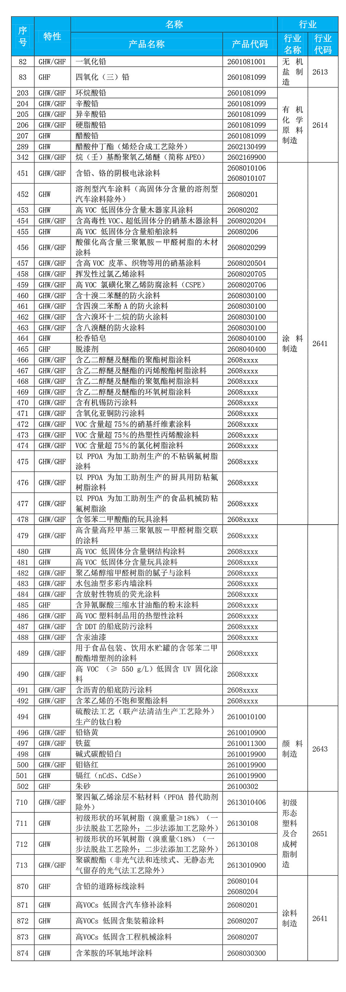 (环境特性一栏中,为简明起见,以GHW代表“高污染”、以GHF代表“高环境风险”。)