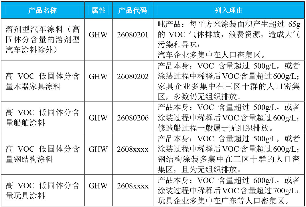 《环境保护综合名录(2017年版)(征求意见稿)》在2015年版的基础上,新增了“双高”产品52种,其中涂料行业增加产品5种,分别是:高VOCs低固含汽车修补涂料、高VOCs低固含集装箱涂料、高VOCs低固含工程机械涂料、含铅的道路标线涂料、含苯胺的环氧地坪涂料,具体信息见下表。