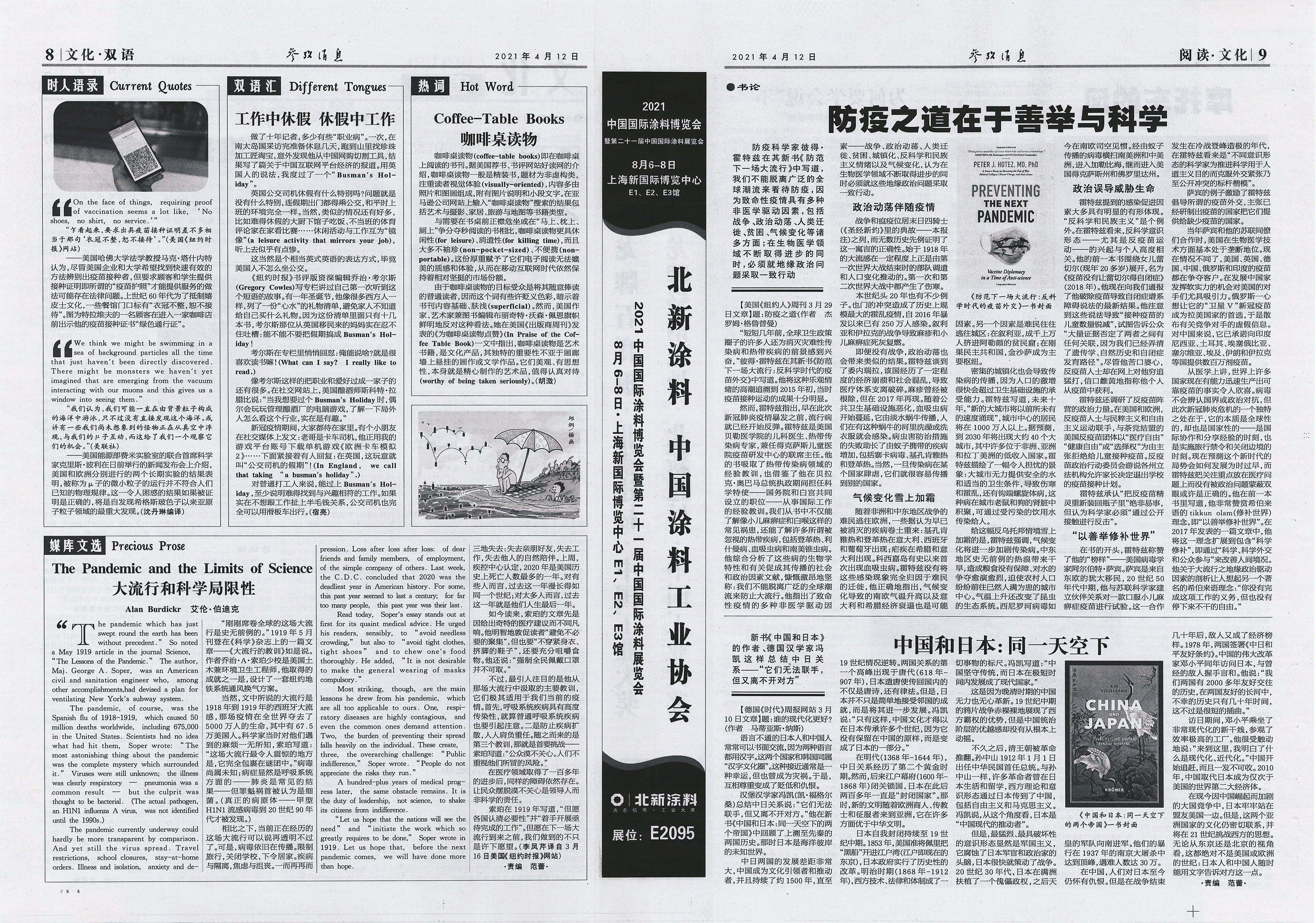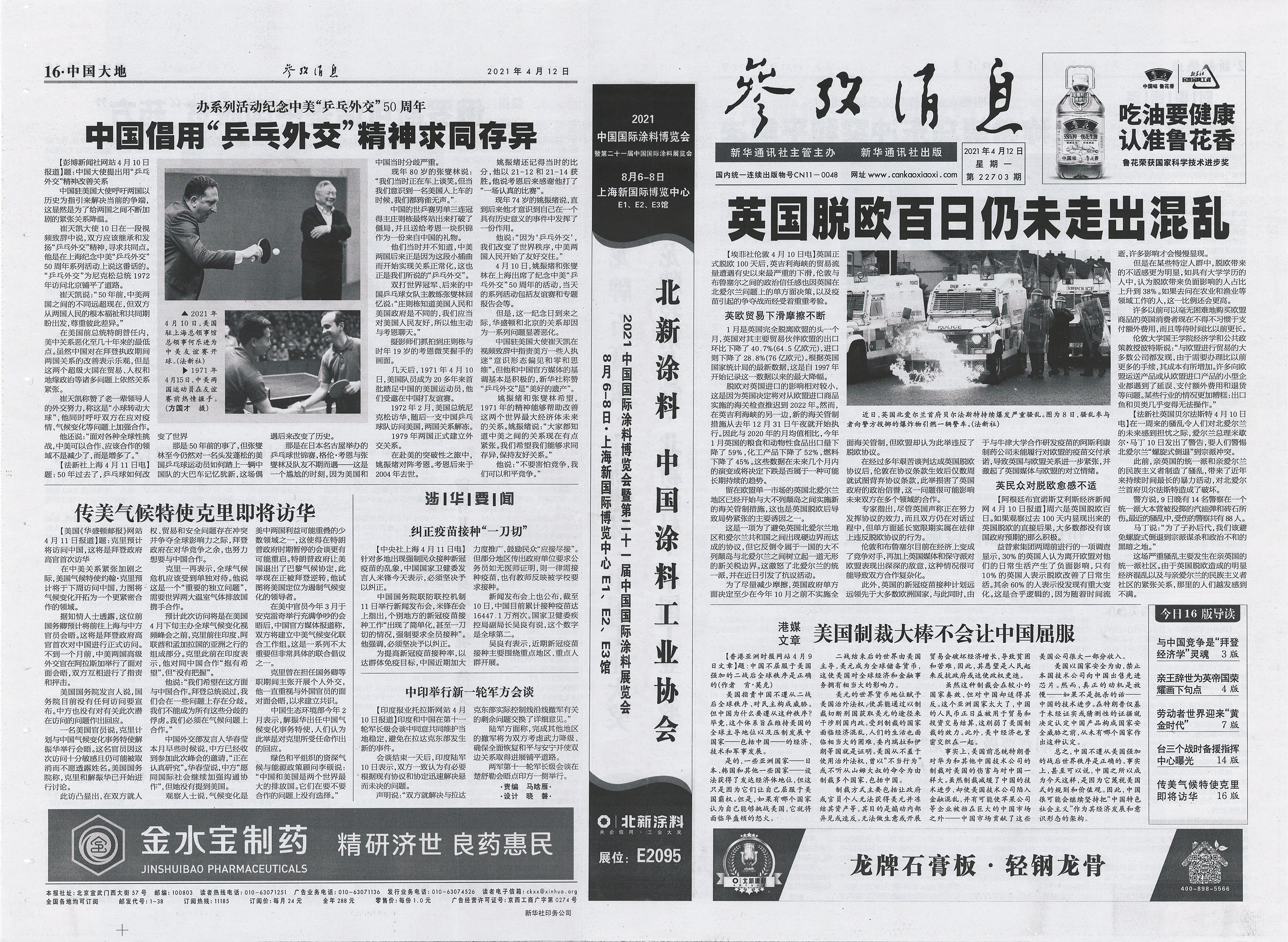 4月12日,世界排名第五、中国发行量最大的日报——《参考消息》,在其显要位置刊登了由best365中国官方网站主办的“2021中国国际涂料博览会暨第二十一届中国国际涂料展览会”(China Coatings Show 2021)相关信息,这意味着,China Coatings Show 2021在国内乃至全球的地位得到进一步巩固,同时,展会的影响力也随着受到国家级媒体的重视迈上了新的发展阶段,将会有更多的目光聚焦8月6-8日上海“2021中国国际涂料博览会暨第二十一届中国国际涂料展览会”!