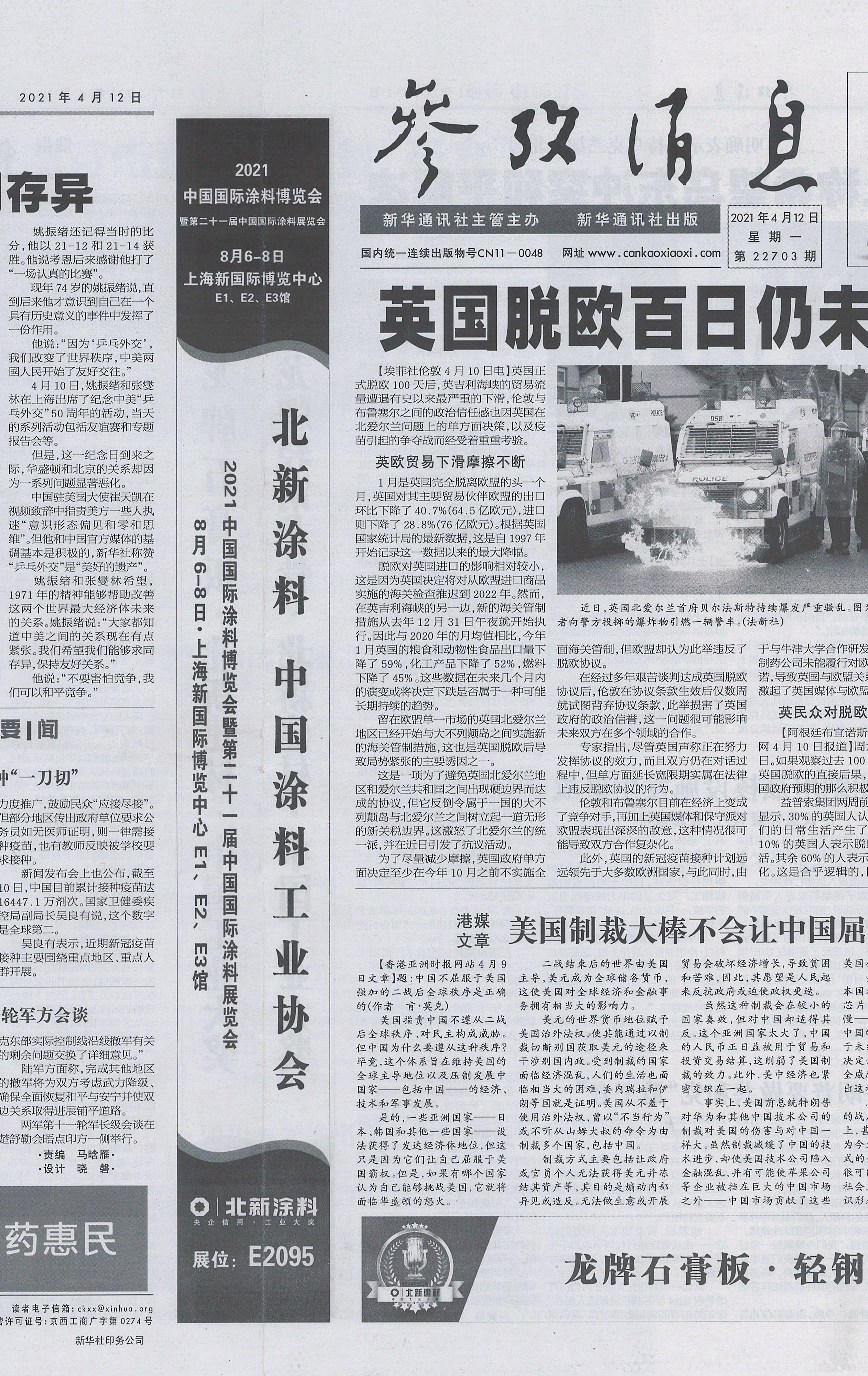 值得一提的是,此次北新建材共同荣登《参考消息》,并将作为“中国国际涂料博览会暨第二十一届中国国际涂料展览会”参展商(展位号E2095)亮相上海。北新建材是世界500强中央企业中国建材集团所属绿色建筑新材料产业平台,1979年在小平同志亲切关怀下成立,1997年在深交所上市(000786.SZ),目前已发展成为中国最大的绿色建筑新材料集团、全球最大的石膏板产业集团。是我国建材行业第一家荣获中国工业大奖、同时荣获全国质量奖+中国杰出质量人的企业。相信随着这样有实力的企业加入,必将会为China Coatings Show 2021增添一抹亮色!