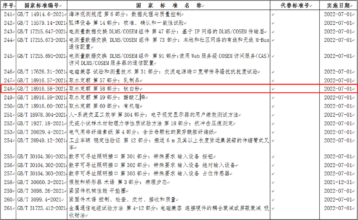 2021年12月31日,国家市场监督管理总局和国家标准化管理委员会联合发布2021年第17号中国国家标准公告《关于批准发布<全息位置地图数据内容>等530项推荐性国家标准和2项国家标准修改单的公告》。其中,《取水定额 第58部分:钛白粉》(GB/T 18916.58—2021)将于2022年7月1日正式实施。标准针对现有企业、新建和改扩建企业、先进企业(企业评优)取水定额进行了详细规定。
