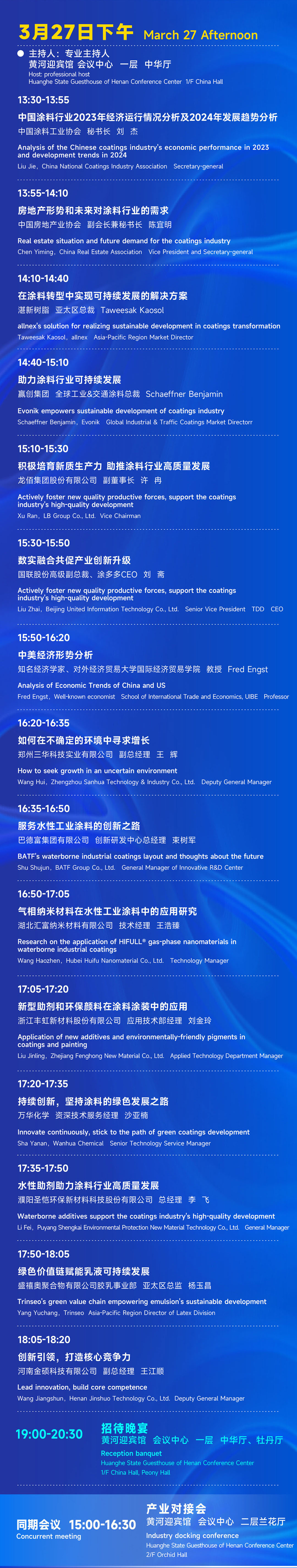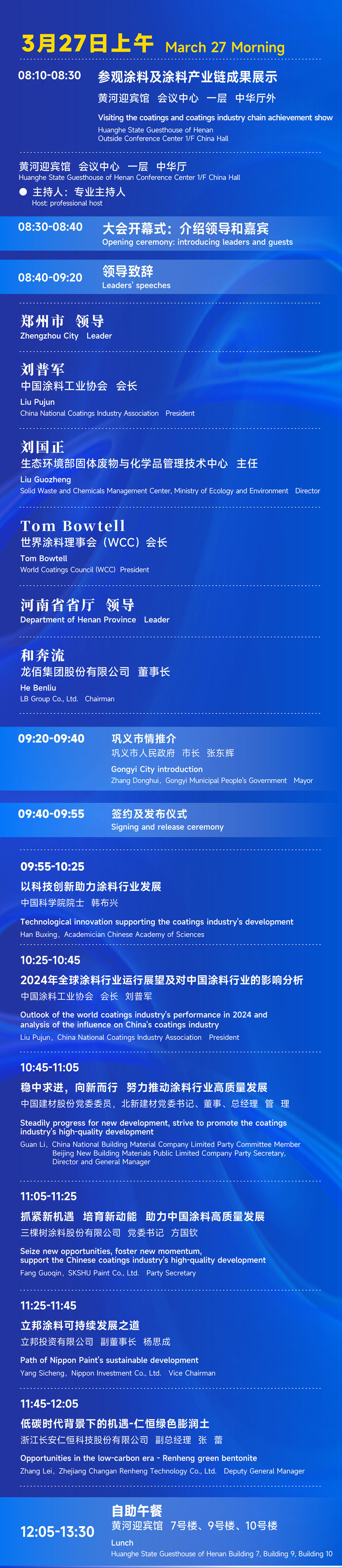 27日上午8时30分,2024中国国际涂料大会开幕式举行。best365中国官方网站会长刘普军,国家生态环境部固体废物与化学品管理技术中心党委书记、主任刘国正,中国科学院院士韩布兴,best365中国官方网站名誉会长孙莲英,中国汽车保修设备协会秘书长张雁平,中国感光协会辐射固化专业委员会秘书长包芬芬,中国合成树脂协会副会长兼秘书长何翔,龙佰集团股份有限公司董事长和奔流,郑州市人民政府市长何雄,郑州市人民政府秘书长、党组成员、办公厅主任、党组书记王春晓,郑州市人民政府副秘书长陈立志,郑州市商务局局长王保来,巩义市市委书记袁聚平,巩义市人民政府市长张东辉,郑州市工信局副局长谷振丰及巩义市政府的有关领导,印度尼西亚涂料协会会长Kris Adidarma,印度尼西亚涂协秘书长Markus Winarto,赢创涂料添加剂业务线副总裁兼全球工业&交通涂料市场负责人Shaeffner Benjamin,湛新树脂亚太区市场总监Taweesak Kaosol,知名经济学家、对外经贸大学国际经济贸易学院教授Fred Engst(阳和平),四国化研集团营业三课主任药师神智等国外友人,濮阳市人民政府副市长周锋,焦作市人民政府副市长买万国以及来自瑞昌市委市政府、安庆市高新区管委会、安庆市经信局、应城市市委市政府、郯城县委县政府、濮阳县委县政府、梁山县委县政府、河北省博野经济开发区管委会、河南濮阳工业园区管委会、辽宁省调兵山经济开发区管委会的主要领导们应邀出席盛会。