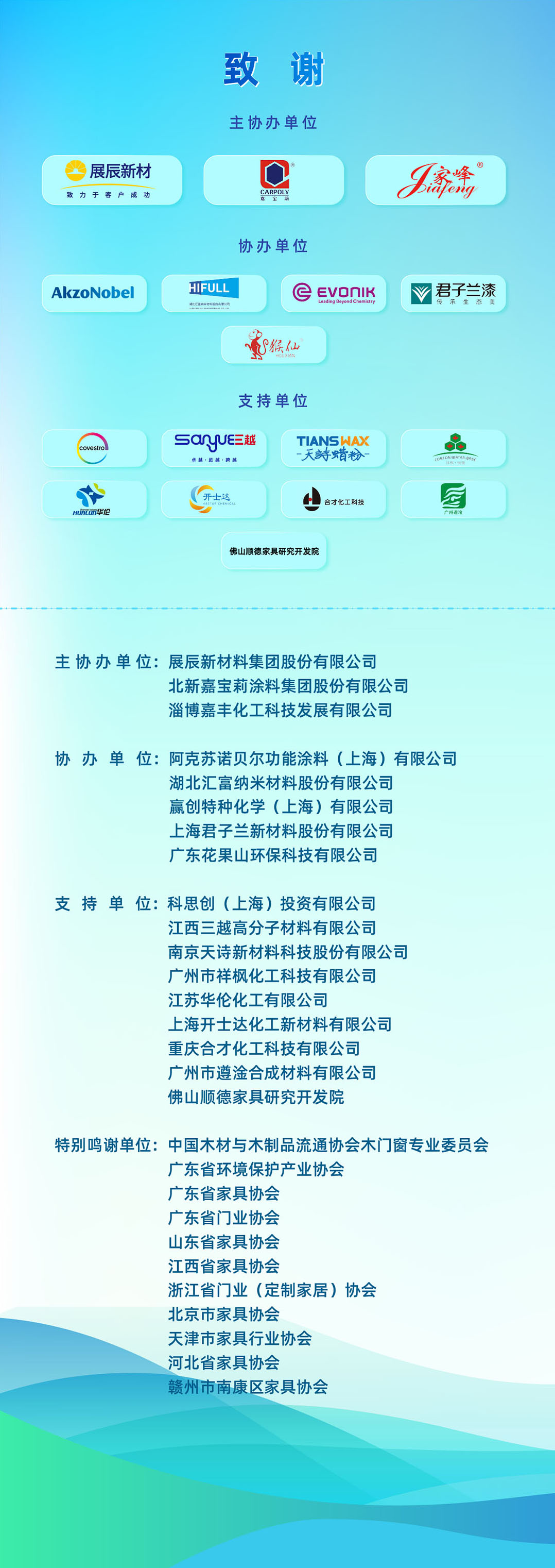 特别感谢本次主协办单位展辰新材料集团股份有限公司、北新嘉宝莉涂料集团股份有限公司、淄博嘉丰化工科技发展有限公司;协办单位阿克苏诺贝尔功能涂料(上海)有限公司、湖北汇富纳米材料股份有限公司、赢创特种化学(上海)有限公司、上海君子兰新材料股份有限公司、广东花果山环保科技有限公司;支持单位科思创(上海)投资有限公司、江西三越高分子材料有限公司、南京天诗新材料科技股份有限公司、广州市祥枫化工科技有限公司、江苏华伦化工有限公司、上海开士达化工新材料有限公司、重庆合才化工科技有限公司、广州市遵淦合成材料有限公司、佛山顺德家具研究开发院,特别鸣谢单位中国木材与木制品流通协会、木门窗专业委员会广东省环境保护产业协会、广东省家具协会、广东省门业协会、山东省家具协会、江西省家具协会、浙江省门业(定制家居)协会、北京市家具协会、天津市家具行业协会、河北省家具协会、赣州市南康区家具协会对本此大会的大力支持。